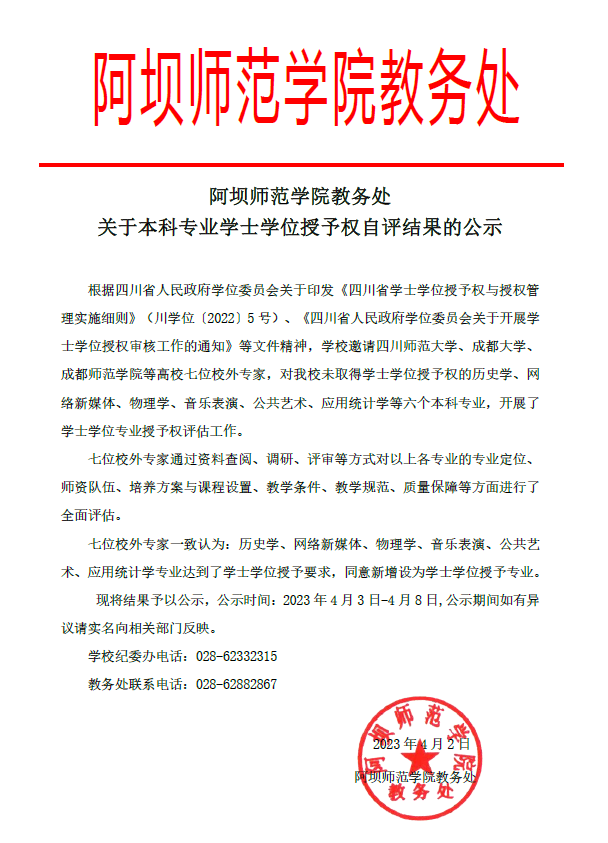 阿坝师范学院教务处关于本科专业学士学位授予权自评结果的公示
