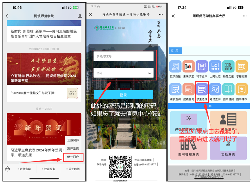 1. 微信关注阿坝师范学院,按照图示要求操作即可进入选课界面(如果第一次进去乱码了,刷新一下页面就进去了),后续操作同电脑端: