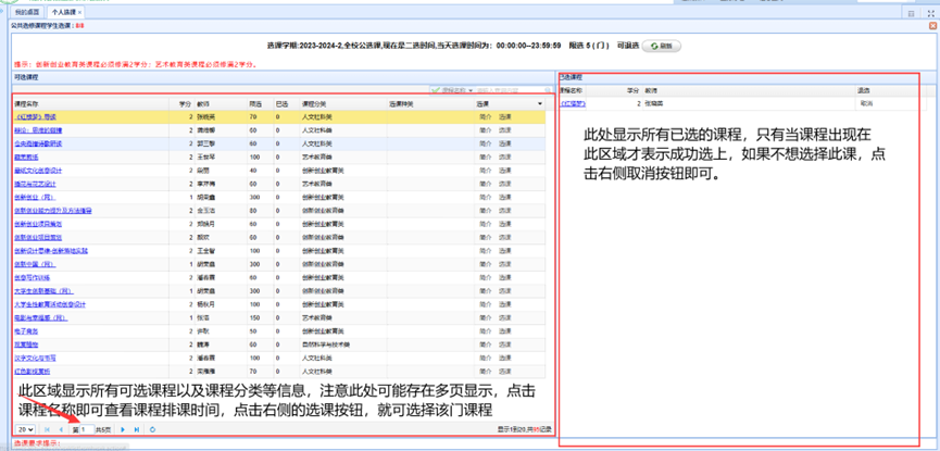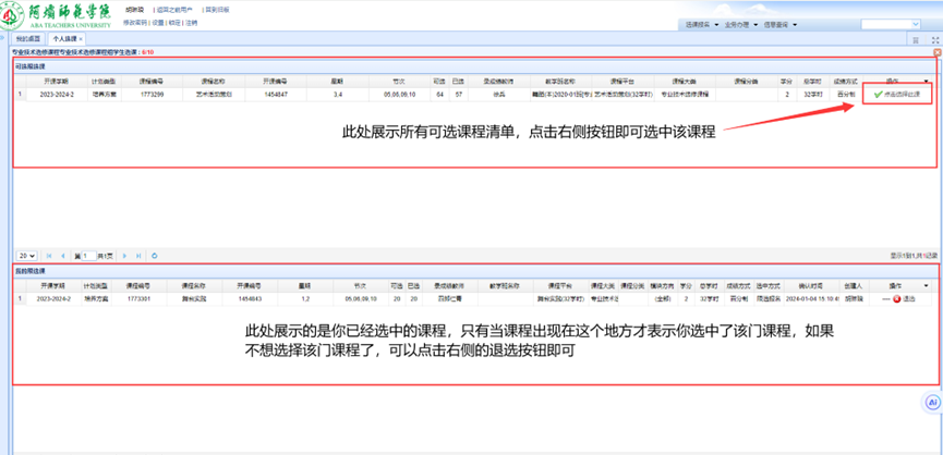 4. 其中专业选修课(含教师教育选修课)选课界面如下所示。