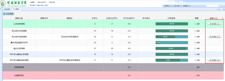 3. 在选课界面中,可以查看各个课程类别的选课入口,同学们点击各个入口进去查看具体的课程列表。