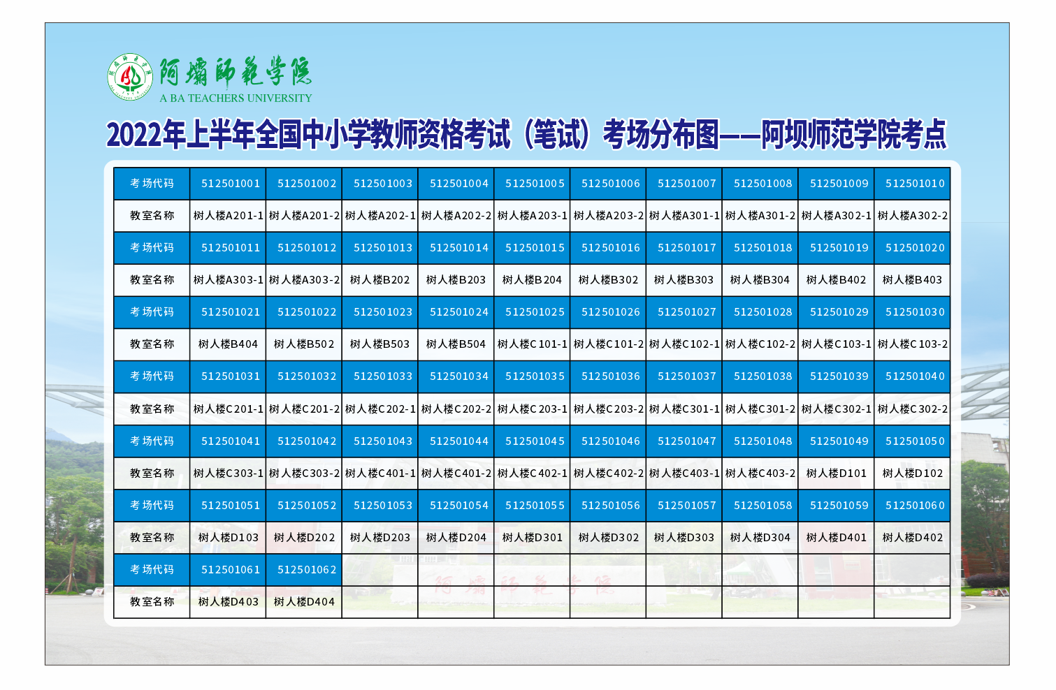 阿坝师范学院考点2022年上半年中小学教师资格考试(笔试)考场分布图