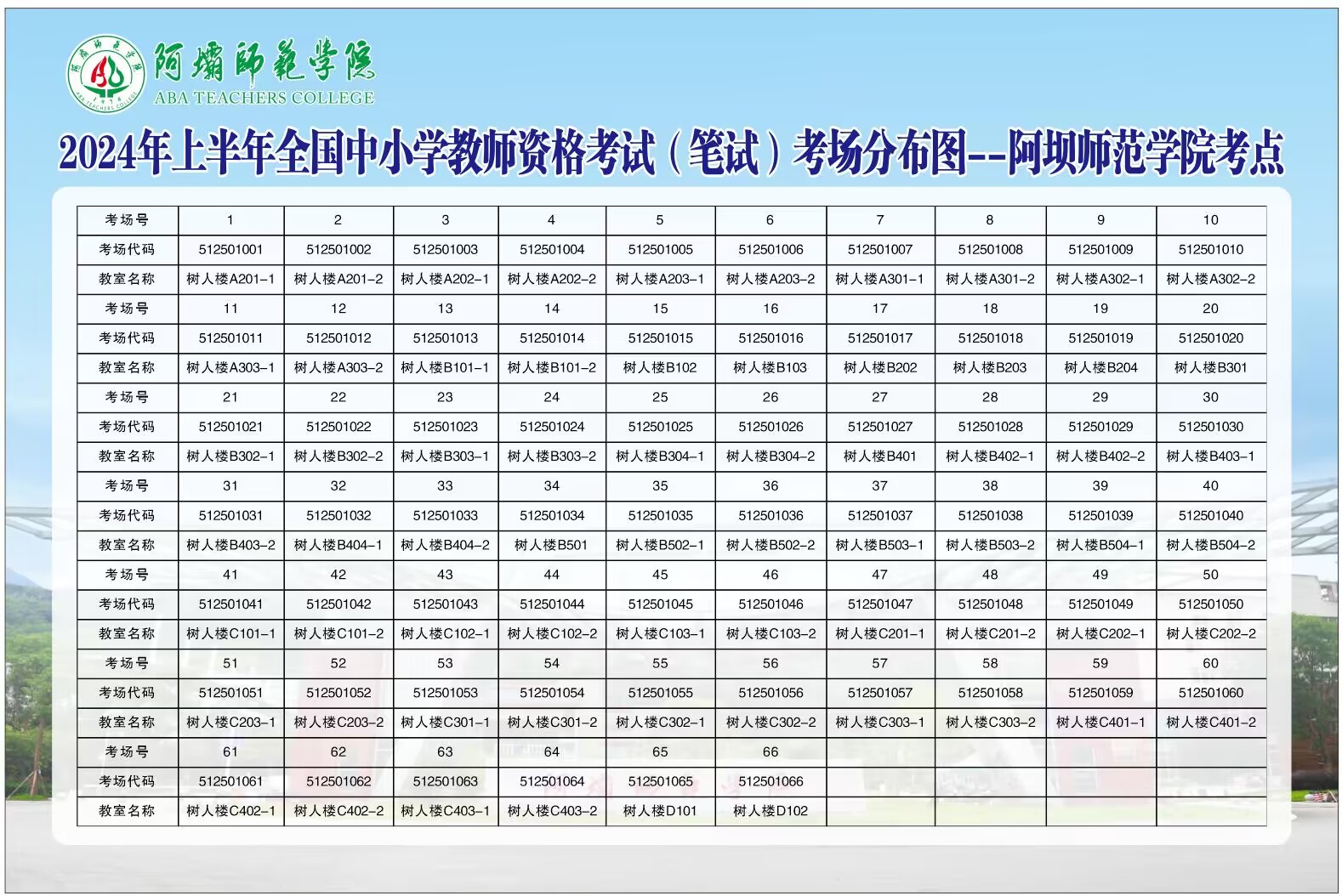 阿坝师范学院2024年上半年中小学教师资格考试(笔试)考场分布图