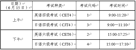 大学英语四六级(CET)考试时间为6月15日,开考科目如下。