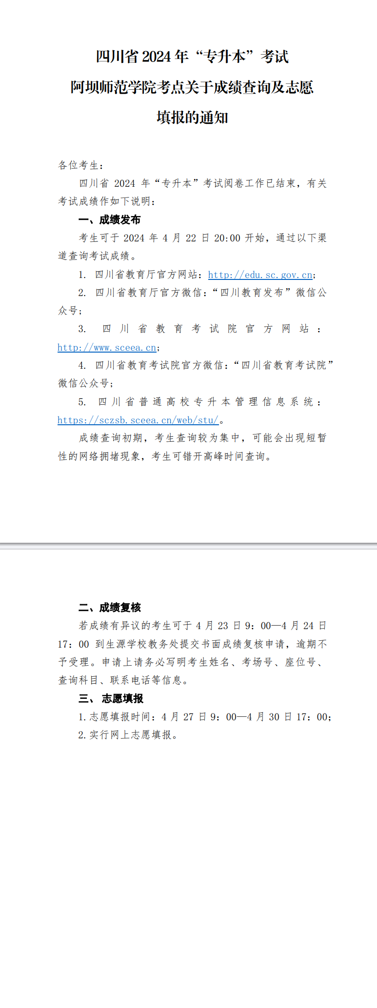 四川省2024年“专升本”考试阿坝师范学院考点关于成绩查询及志愿填报的通知