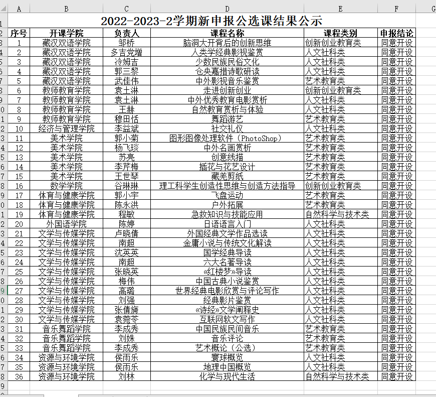 2022-2023-2学期公共选修课申报工作已经结束,经二级学院组织专家进行评审后,现将申报结果予以公示如下: