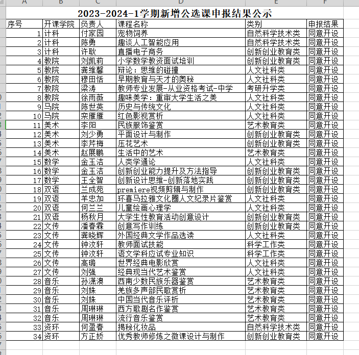 2023-2024-1学期新增公共选修课申报工作已经结束,经二级学院组织专家进行评审后,现将申报结果予以公示如下:请申报成功的教师在教务系统按照附件教程进行课程信息上报。