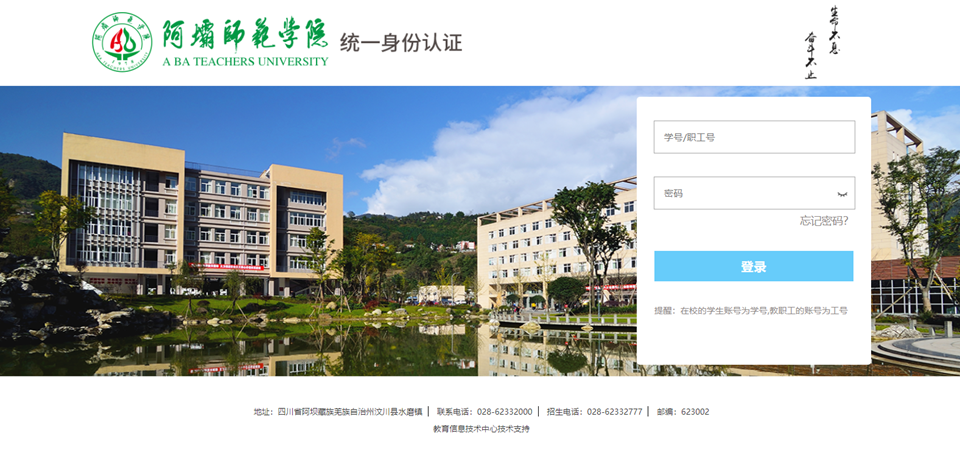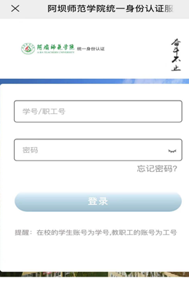 选择“阿坝师范学院”,自动跳转到统一身份认证登录界面,输入统一身份认证的账号和密码,点击登录。