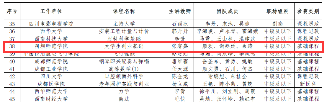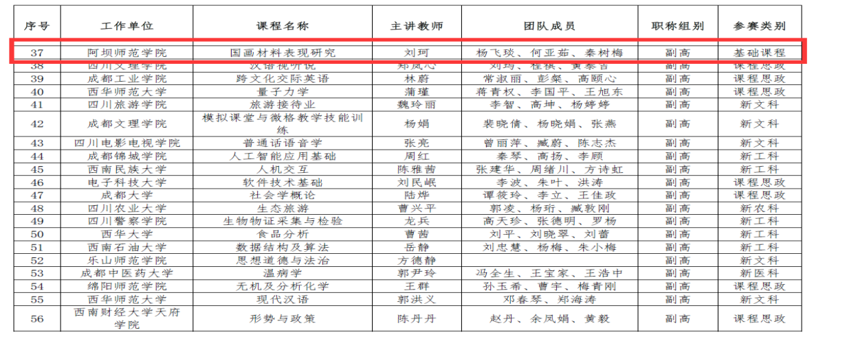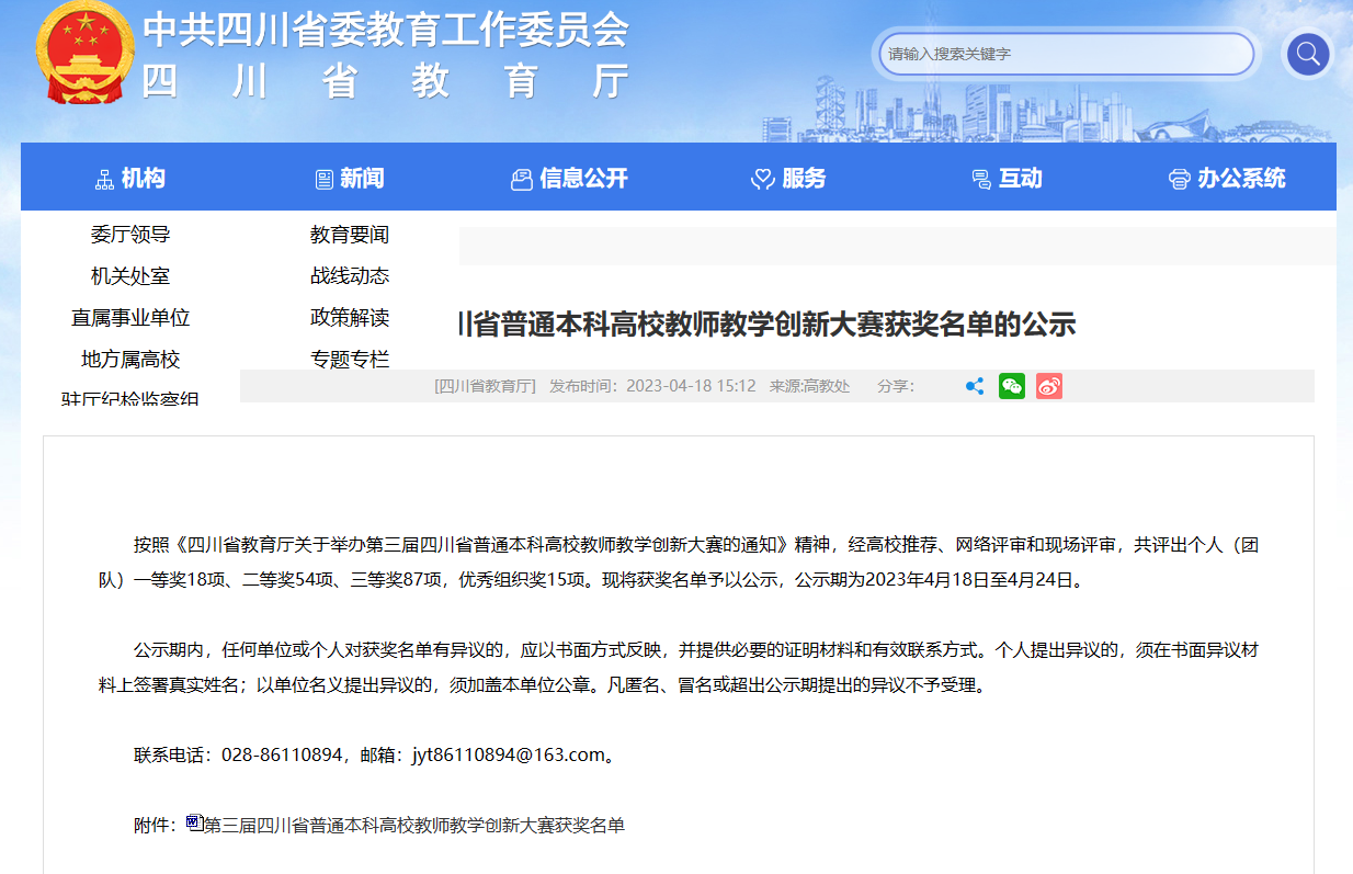 在2022年12月-2023年4月,由四川省教育厅主办,四川省高等教育学会承办的四川省第三届普通本科高校教师教学创新大赛中,我校经济与管理学院教师张睿嘉及其团队(颜欢、谢廷廷、余涛)荣获二等奖1项;美术学院教师刘珂及其团队(杨飞琰、何亚茹、秦树梅)荣获三等奖1项。