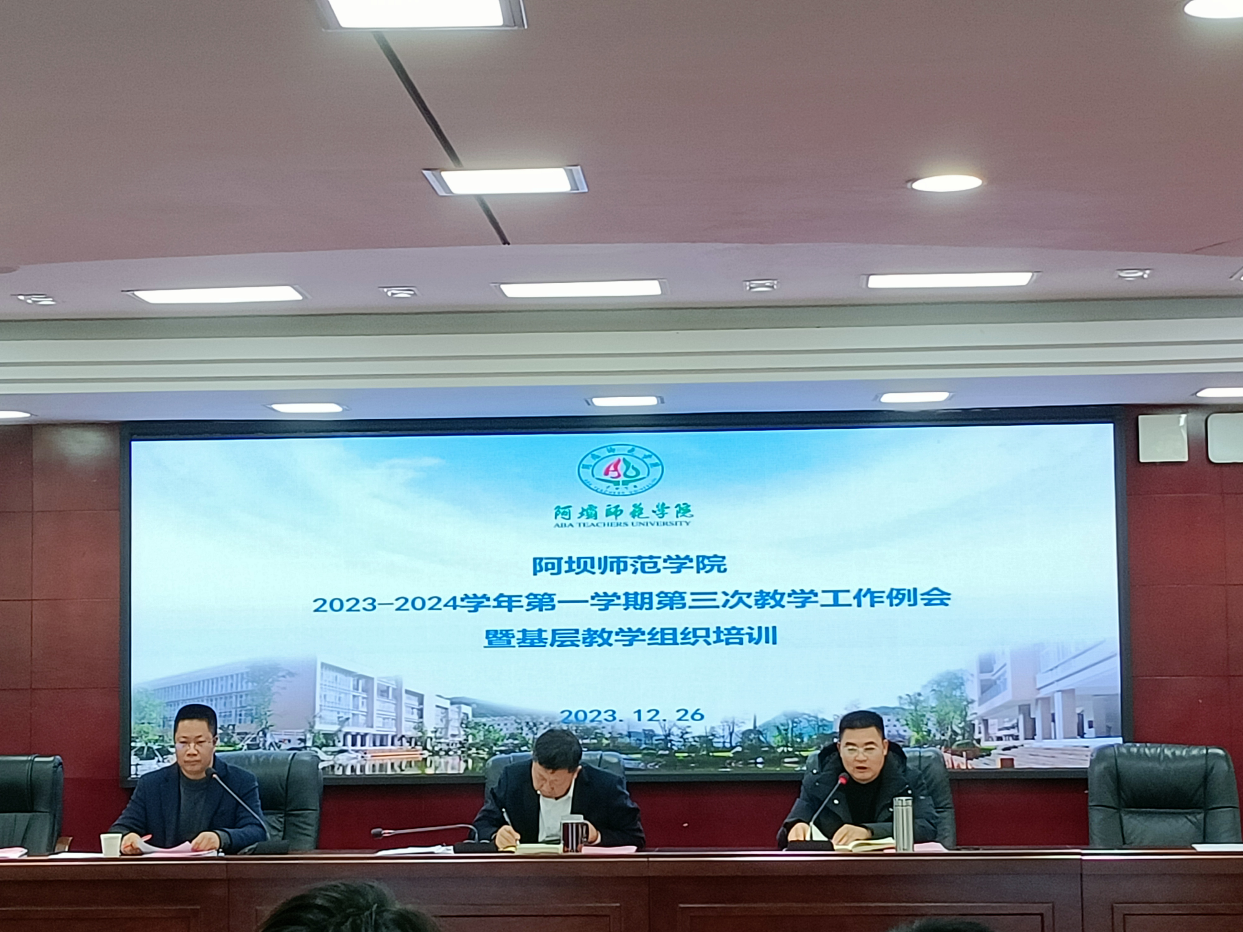 2023年12月26日,我校召开2023-2024学年第一学期第三次教学工作例会暨基层教学组织培训。会议由教务处处长黄成兵主持,校长向武、副书记毛英出席会议并讲话。教学质量监控与评估中心、党委教师工作部·人事处及教务处负责人、各二级学院书记、院长、副院长及本科专业教研室主任、专业带头人、教科办主任参加了本次会议。