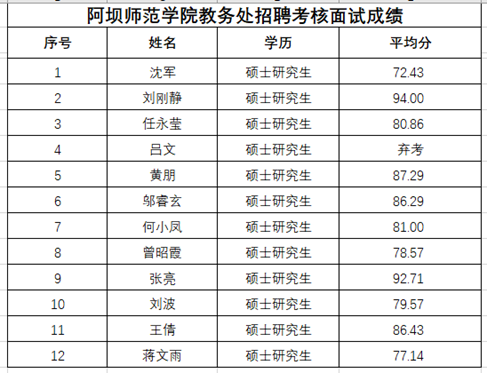 在纪委工作人员的全程监督下,经过阿坝师范学院教务处招聘考核领导小组的全面、公正考核、考察,现将参加面试考核的12位考生成绩公布如下: