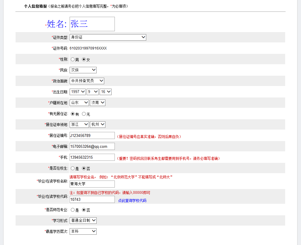 1.因报考人数众多,请本校考生及时上网报名。工作单位一栏填写本人所在二级学院名称,并如实填写学制、当前年级、专业、学籍学号等信息。
