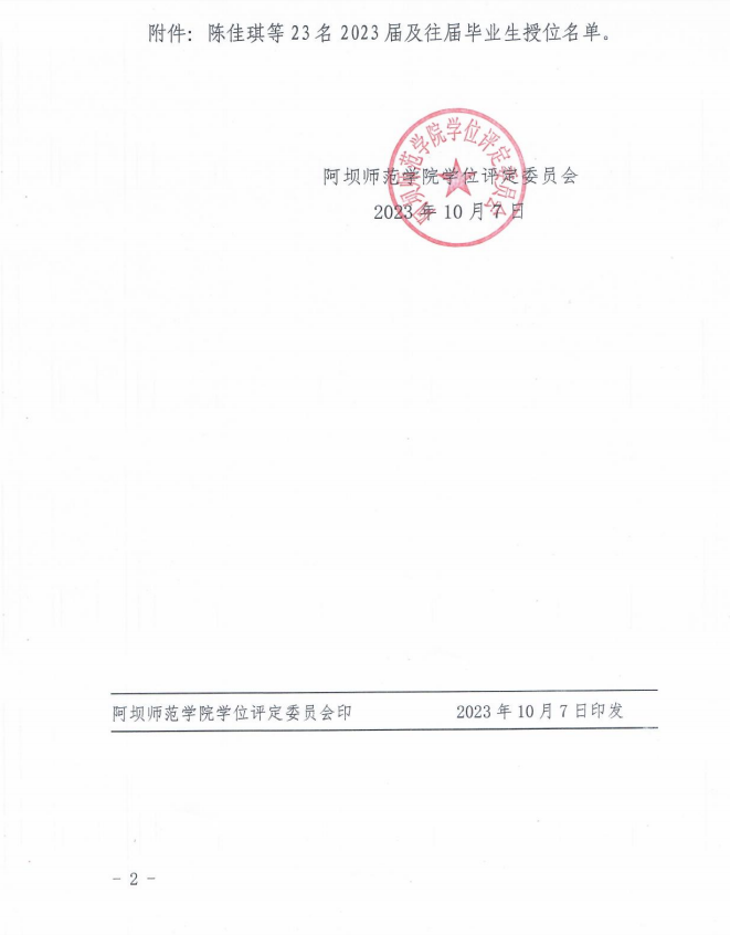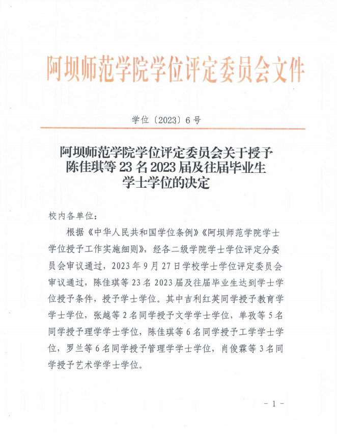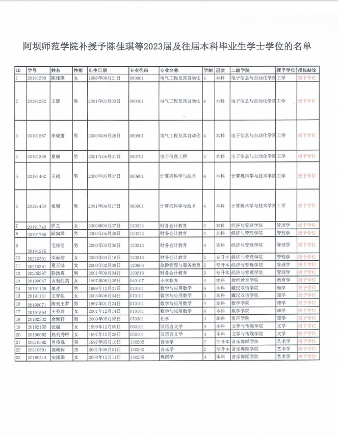 阿坝师范学院学位评定委员会关于授予陈佳琪等23名2023届及往届毕业生学士学位的决定