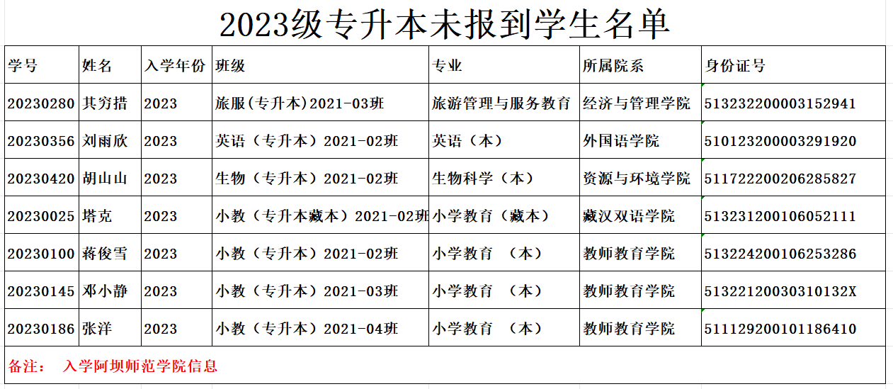 根据《阿坝师范学院学籍管理规定》《阿坝师范学院2023年专升本学生入学通知》要求,其穷措等7名同学未在规定时限内报到。现对2023年专升本未报到学生名单予以公示,公示期为2023年9月18日至2023年9月22日,如在公示期内,仍未报道,视作放弃入学资格。如有异议,请向教务处反映,电话:028-62332865,邮箱jwcexam@126.com。