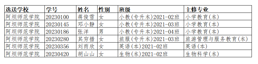 根据《阿坝师范学院学籍管理规定》《阿坝师范学院2023年专升本学生入学通知》要求,蒋俊雪等6名同学未在规定时限内报到,并于2023年9月18日至2023年9月23日在教务网公示,在公示期内,仍未报道,视作放弃入学资格。电话:028-62332207,邮箱jwcexam@126.com。